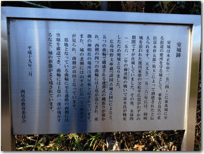 吉良町の東条城跡から北北東約3kmに東条吉良氏の家臣富永氏の居城であった室城跡がある。主郭跡は墓地となり、井戸跡や土塁跡が遺構として残っている。 室城城主の富永氏はかつて野田郷(新城市野田)に館(野田館)を構えて設楽郡から宝飯郡にわたる広大な所領を有していた。その分家の富永資良が三代将軍足利義満に仕え、二代行康は足利義政に仕えた。三代資正が応仁二年(1468)に吉良義信に仕えて以降は富永氏は吉良氏の重臣として続いた。 四代正安は吉良義信の後継義堯に仕え、永正年中(1504-21)に東条城に至る街道の要所を守る城として室城が創築されたといわれる。 五代忠安は東条城の吉良持広に仕えた。天文五年(1536)には岡崎城を桜井松平信定に追われた松平広忠を吉良持広の尽力によって家老富永忠安の室城に迎えている。しかし、松平信定の知るところとなり、室城は攻められてしまう。広忠らは城を焼いて今橋城(吉田城)へ移ったとされ、翌年に今川義元の支援を受けて岡崎城へ復帰した。広忠は室城の神明社に三つ葉葵の紋を奉納したという。 その後、三河の世情は変わり続けた。松平広忠は尾張織田氏との戦い渦中で没した。また東条吉良持広も没して養子の吉良義安が継いだ。その義安も今川氏によって幽閉され、その弟の義昭(よしあきら)が今川の手によって東条城に入った。 富永氏は一貫して東条吉良氏に仕え続けたと思われ、弘治年間(1555-58)頃には東条城城主吉良義昭の重臣であった。六代富永伴五郎忠元である。 永禄三年(1562)、桶狭間合戦で今川義元が織田信長に討たれると今川方であった松平元康は信長と結んで三河統一のために今川方の吉良義昭と対立を深めていた。 永禄四年(1563)四月、吉良義昭が仕掛けた善明堤(鎧ヶ淵古戦場)の戦いによって松平元康は深溝松平好景や板倉好重らを討取られた。富永伴五郎忠元はこの戦いで義昭の一手を担って善戦している。 しかし、九月になると元康は東条城を攻めるために付城を築き、小牧砦(後の小牧陣屋)を本陣として七百余騎で東条城へ迫った。一方の東条城からは豪勇無双二十五歳の富永伴五郎忠元が三百六十余騎を率いて城外の藤波畷(藤波畷古戦場)に布陣した。戦いは多勢の松平勢が優勢で、伴五郎忠元も終には討死してしまった。頼みの伴五郎忠元を失った吉良義昭は元康に降伏した。 戦後、室城には元康の家臣本多広孝が入ったが、広孝は数年後には田原城主となって移ったため、廃城となったらしい。 現在、墓地となっている主郭西側の土塁跡に「牟呂城跡」の標柱が立てられていたが、朽ちてしまっている。東側の三つ葉葵を紋とする神明神社の境内はかつて蔵屋敷と呼ばれていた。 |