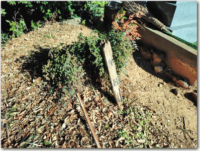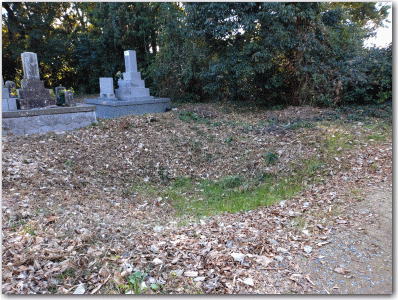 ![]() ▲墓地の中央近くの南側のくぼみ。かつての井戸跡とされている。 |
