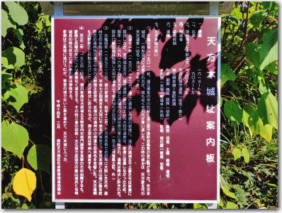 ![]() ▲城址説明板。天正二年(1574)の犬居攻めの事まで記されている。 |