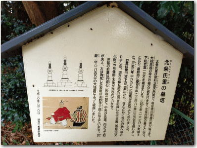 ![]() ▲基壇上に三基の笠塔婆が建つ。中央が北条氏重、右が氏重夫人、左が近臣河野作十郎である。 |