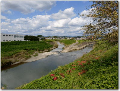 ▲ 逆川越しに砦跡を望見。高台の住宅地が砦跡である。現在では砦跡全域が宅地化され、