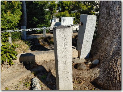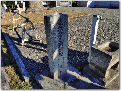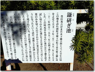 ![]() ▲天白神社鳥居前の「豊臣秀吉鎌研池」の碑。天文二十年(1551)三月から同二十二年(1553)四月の間、秀吉は頭陀寺城主松下家に下僕として奉公したという。 |