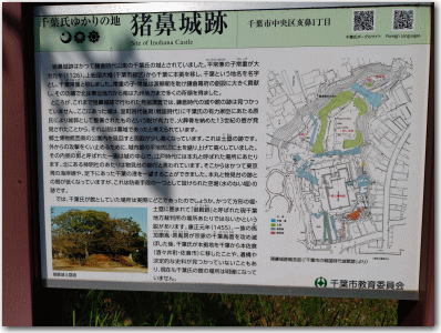 千葉県庁の東側の丘を亥鼻山と呼び、その北半の亥鼻公園部分が猪鼻城址(文化財としての名称)とされている。通称、千葉城として知られる。城址東側の千葉大学及び七天王塚までを含む広大な範囲も城域とする見方があるが、発掘調査によって中世の遺構がほとんど見られなかったことから現在では亥鼻公園部分に限定されるのが通説となっている。 猪鼻城址の説明板にある城跡の概念図によれば主郭を中心に南側を二郭、北側を三郭としている。二郭には千葉市立郷土博物館として四層五階の模擬天守がそびえている。そして博物館入口前には大空に鏑矢を放つ千葉介常胤公の騎馬像が雄々しく建っている。ここは源頼朝の挙兵に従い、大きな力となった千葉常胤の根拠地であったのだ。 千葉氏は桓武平氏の流れで高望王の曽孫平忠常がはじめて下総(香取郡東庄町)に館を構えたとされる。平安中期のことである。さらにその曽孫常兼が千葉郷の大椎(千葉氏緑区)に拠点を移して大椎権介を称した。そして常兼の子常重が大治元年(1126)に本宗家の拠点として亥鼻の地に居館を構えて千葉介を称し、千葉氏初代となった。常重の子が常胤である。 保延元年(1135)、家督を継承した常胤であったが、保元・平治の乱(1156/1159)では源義朝に従ったがために所領の多く(相馬御厨や立花郷)を平氏に取られてしまい、千葉郷に逼塞せざるを得なくなっていた。治承四年(1180)、源頼朝が伊豆に挙兵した。しかし、石橋山の戦いに敗れた頼朝らは真鶴岬から海路安房へ逃れ、房総の武士らの結集を図った。常胤はいち早く頼朝の求めに応じ、鎌倉開府を進言して平氏との戦いや奥州合戦にと全国を駆け巡り戦功を重ねた。 頼朝から師父と慕われた常胤は相馬御厨や立花郷の所領はもとより、下総・上総そして東北や九州にまでその所領を拡大した。常胤の六人の子らは下総国内をそれぞれ分割して相続し、土地の名を名乗って千葉六党と称された。長男胤正は千葉宗家、次男師常は相馬氏、三男胤盛は武石氏、四男胤信は大須賀氏、五男胤通は国分氏、六男胤頼は東氏である。 常胤以降、千葉氏は下総国守護として鎌倉から室町時代へと至る。十五代胤直のとき、関東では古河公方足利成氏と関東管領上杉との抗争が激化していた(享徳の乱)。康正元年(1455)、胤直は上杉方に属していたが成氏方で千葉一族の馬加(まくわり)康胤と原胤房に猪鼻城を襲われたため、城を落ちて千田庄多胡に逃れた。馬加康胤、原胤房らはさらに多胡に兵を進め、胤直、胤宣父子を自刃に追い込んで宗家を滅ぼしてしまった。 千葉宗家の家督は康胤が奪ったが、翌年の康正二年(1456)には幕府の追討軍(東常縁/千葉六党東氏の子孫)によって子の胤持共々討たれてしまった。その後、康胤の後継として子とされる輔胤が継いで猪鼻城に入ったとされるが、文明年間(1469-86)には本佐倉城(印旛郡酒々井町)を築いてそちらへ移った。その後、佐倉千葉氏は八代続いたがやがて後北条氏の支配下に置かれ、天正十八年(1590)にはついに豊臣秀吉によって小田原城落城とともに滅亡してしまう。 猪鼻城は発掘調査の結果から鎌倉期の出土遺物が見られないことから、戦国期に整備されたものとされ、馬加氏と原氏が千葉宗家を滅ぼした後に整備したものと見られている。その後も原氏によって維持され続けたとされているが、詳細な城史はよく分からない。なお、鎌倉期の千葉氏の居館は亥鼻山の北西、都川の対岸でかつて御殿跡と呼ばれた千葉地方裁判所のあたりに比定されている。 現在は主郭に土塁跡の遺構が見られる。主郭の北側の三郭には神明社があり、物見台跡とされている。そして二郭には模擬天守の資料館が建てられている。その他各種の石碑が公園内に建てられ、桜の時期には多くの人々で賑わうようだ。 |