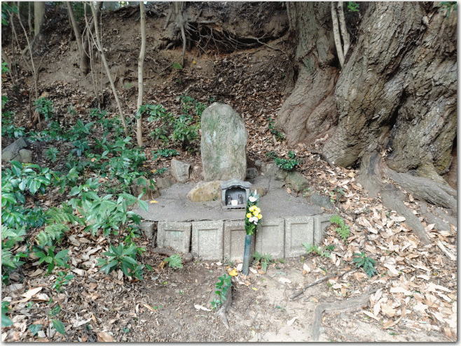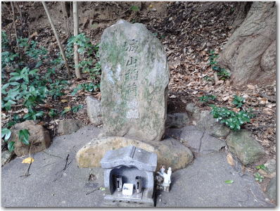 ![]() ▲工場建設時に西方寺へ移された城山稲荷碑。昭和26年(1951)、城跡に建立され、昭和46年(1971)に西方寺へ移された。 |