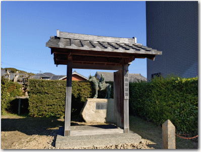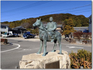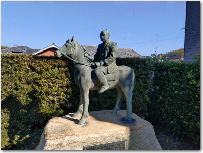 ![]() ▲山門前の駐車場にも義央の馬上像があった。 |