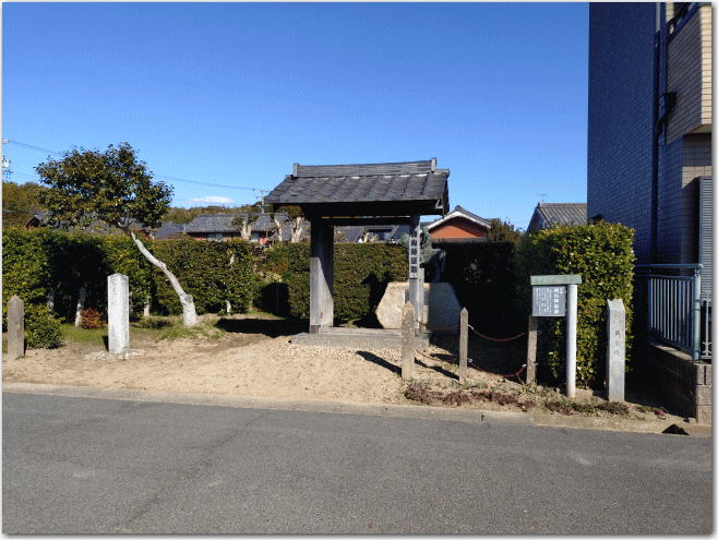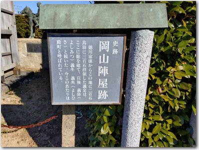 吉良町岡山の字殿町の道路脇の一画に岡山陣屋跡が史跡として残されている。殿町というのは吉良の殿様の屋敷があったということなのだろうか。遺構と言えるものは無いが、模擬の陣屋門が建てられていてそれらしい雰囲気を出している。 名門吉良氏は今川氏背いた義安が弘治元年(1555)に捕えられて駿河国薮田(藤枝市)幽閉され、そこで亡くなった。その後を継いだ義昭も松平元康(徳川家康)との抗争に敗れて敗走、三河から姿を消した。吉良氏の断絶である。しかし、義安の幽閉先で嫡男義定が生まれていた。 永禄十二年(1569)、義安の妻俊継尼は幼い義定を連れて薮田から吉良の地に戻り、椿屋敷に住した。松平清康の娘で家康の叔母という関係から松平家の忠臣として知られる鳥居伊賀守忠吉が岡山に隠居しており、何らかの支援があったものと思われている。とはいえ、生活は苦しかったに違いない。 天正七年(1579)、家康は鷹狩に吉良を訪れた際に俊継尼と義定に対面した。この時に俊継尼に食禄二百石、義定に鳥羽(西尾市鳥羽町)三百石を給した。俊継尼と義定はこれを機に吉良家再興を果たすことになる。義定は家康に出仕して岡山に屋敷を構えた。 慶長五年(1600)の関ヶ原合戦には義定と嫡男義弥(よしみつ/十五歳)が参陣した。戦後、吉良本領三千石が義弥に与えられた。岡山、横須賀、饗庭、小山田、宮迫、乙川の六ヶ村と鳥羽村で計三千二百石となり、岡山の屋敷は岡山陣屋として所領支配の役所となった。また所領南部の乙川村や鳥羽村には出先機関として姫山陣屋が設けられた。 慶長十六年(1611)には義弥が歳首の賀使として上洛参内しており、高家としての吉良家がはじまった。以後、吉良家は朝廷と幕府の間の交渉や使者の役目を果たして行くことになる。 寛永二十年(1643)義弥没して嫡男義冬が継いだ。幕府は上野国緑野郡白石村(群馬県藤岡市)他千石を義冬に加増した。 寛文八年(1668)若狭守義冬没して嫡男上野介義央(よしひさ)が継ぐ。義弥以来、高家旗本として江戸住いであったが、延宝五年(1677)に京都の用務を終えて江戸へ戻る際に義央は初めて吉良の領地を訪れた。 そして貞享三年(1686)に義央は背撫(せだて)山と寄名(きな)山の端を利用して堤防を築いた(吉良町岡山下り松)。これは増水の度に吉良の新田地帯が水害に見舞われていたのを防ぐためのもので、下流八千石の田を水害から救ったと言われている。工事には領内の老若男女こぞって参加し、一晩で完成したと伝えられている。隣接の西尾藩はこの工事に反対したが、義央は決壊したら二度と築堤はしないと誠意を尽くして約束したという(現地説明板)。後に人々は義央の善政を讃えて、この堤防を「黄金(こがね)堤」と呼んだ。 元禄十四年(1701)三月、義央は江戸城松の廊下で浅野内匠頭長矩に斬りつけられる。義央は隠居して外孫で養子の義周に高家職を譲った。そして翌年(1702)十二月、浅野家旧臣らに江戸本所の屋敷を襲われて首を討たれてしまうのである。赤穂浪士の討入りである。この討入りの際に、義周も屋敷内で奮戦したが重傷を負っている。元禄十六年(1703)二月、義周は領地召し上げ、諏訪へ配流となった。宝永三年(1706)一月、配流先にて病没、享年二十一歳であった。吉良氏二度目の断絶である。 召し上げとなった吉良領は宝永二年(1705)に三千石が旗本津田正房に引き継がれた。陣屋も引き続き岡山陣屋が明治にいたるまで津田氏によって利用され続けた。 現在、陣屋跡には「陣屋の椿」と呼ばれる椿の木が門脇にある。門をくぐると馬上姿の吉良義央の像がある。この義央馬上像は「黄金堤」と華蔵寺前にも建てられている。 |