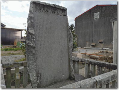 ![]() ▲「鎧掛松及蛇枕石之碑」。鎧掛松と蛇枕石の由来が記されている。明治四十年(1907)岡崎道路改修により両者共に伐採或いは埋められて位置も分からなくなってしまった。そこで遺跡の隠滅を惜しみ、この碑を建て後世に伝えようとした。平成四年(1992)の道路整備により現在地に移された。 |